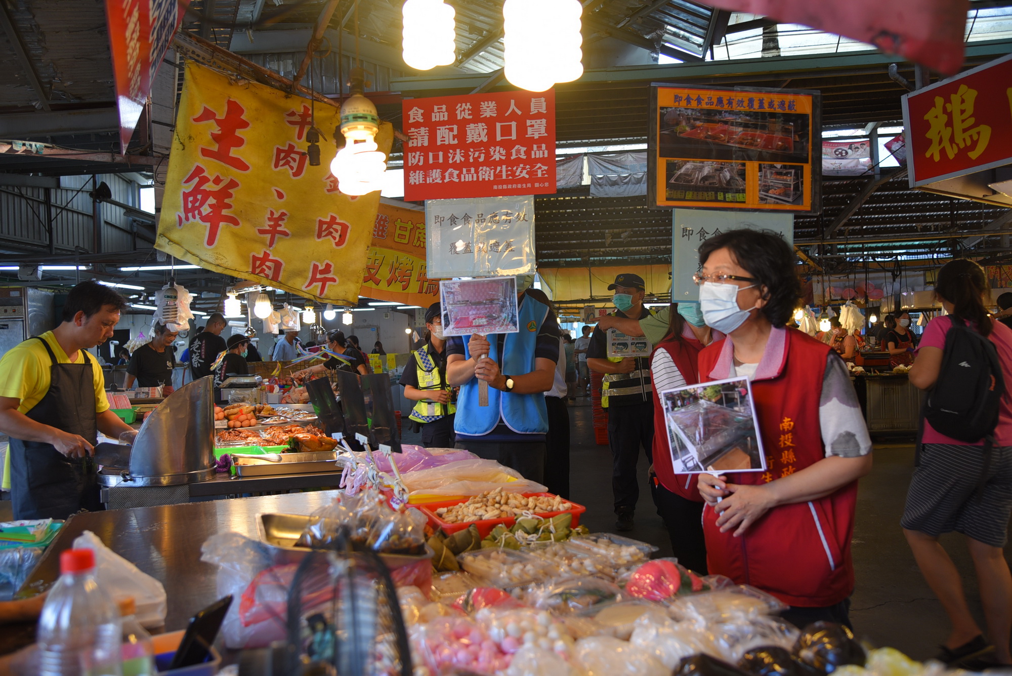 草屯成功黃昏市場攤商販賣食品有生鮮魚肉、蔬果、熟食等,每日都有許多民眾前往採購,是草屯鎮傍晚時間最多人潮的地方之一,縣府特別到場宣導,由衛生局食品科長謝伶華率隊,衛生局、警察局、建設處人員手持立牌、擴音器,提醒民眾保持室外1公尺、室內1.5公尺的社交安全距離,在人潮密集處應戴上口罩提升自我防護能力,降低社區感染的風險。