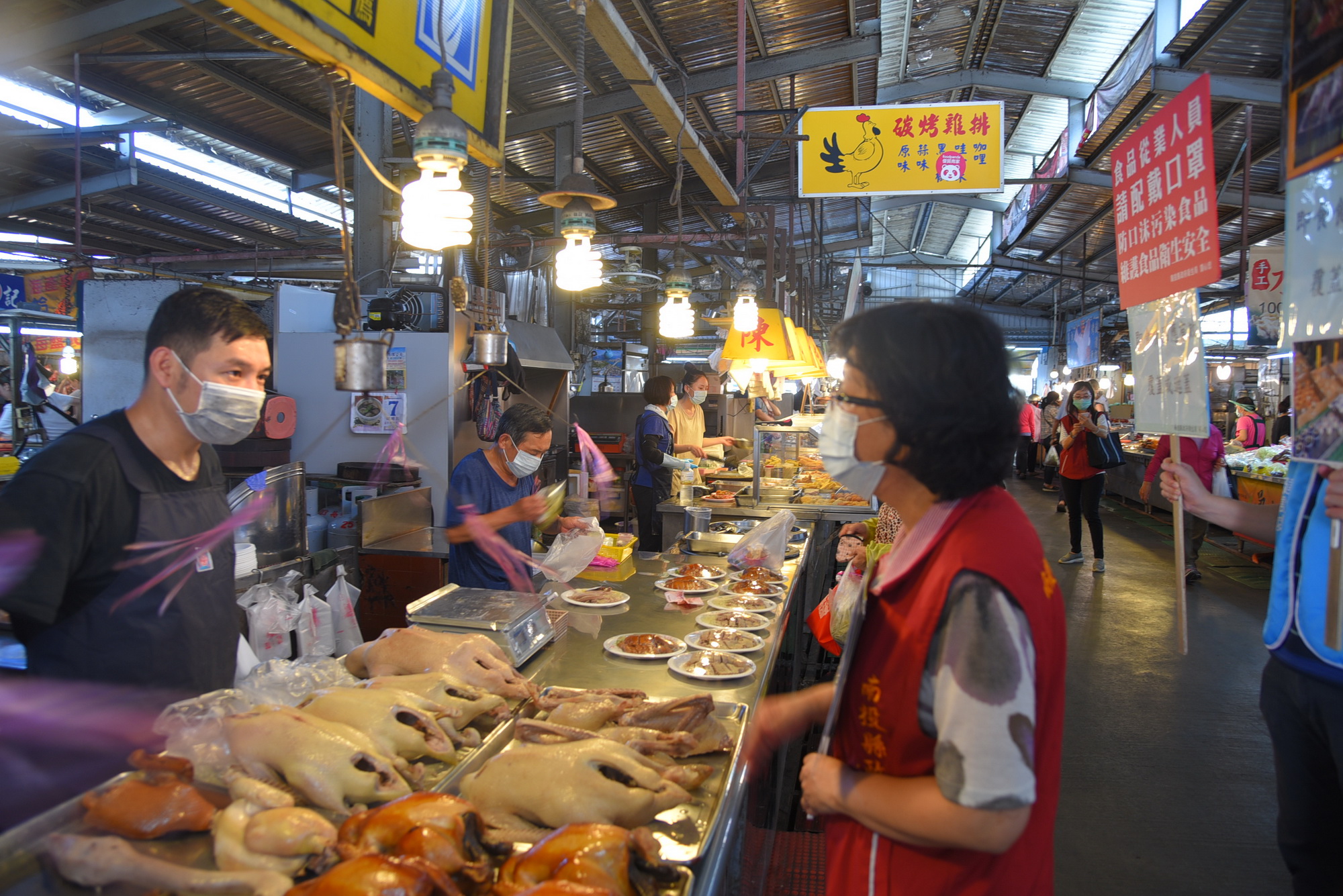 此次宣導過程中,可發現多數攤商及採購民眾皆未配戴口罩,針對部分沒戴口罩的攤商,以及熟食區食物未進行遮蔽情形,宣導人員也立即進行柔性勸導,並提供口罩指導如何正確配戴,希望攤商做好個人健康管理,如有身體不適,應停止食品相關作業,也要求店家即食食品務必覆蓋或遮蔽,並暫停試吃活動,避免攤商或民眾飛沫噴濺,影響食品安全衛生。