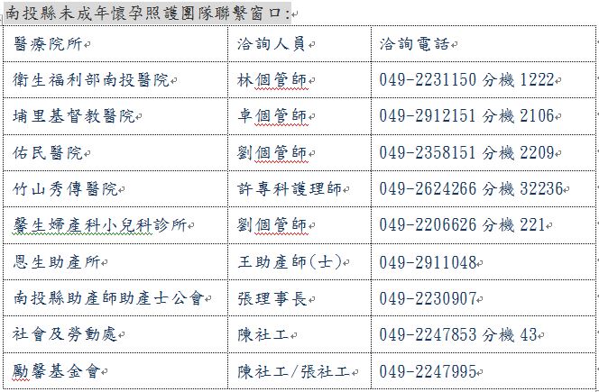 目前縣內未成年懷孕照護團隊有衛生福利部南投醫院、埔里基督教醫院、佑民醫院、竹山秀傳醫院、馨生婦產科小兒科診所、恩生助產所、南投縣助產師助產士公會、社會及勞動處及勵馨基金會等,民眾如有相關問題可至電洽詢。