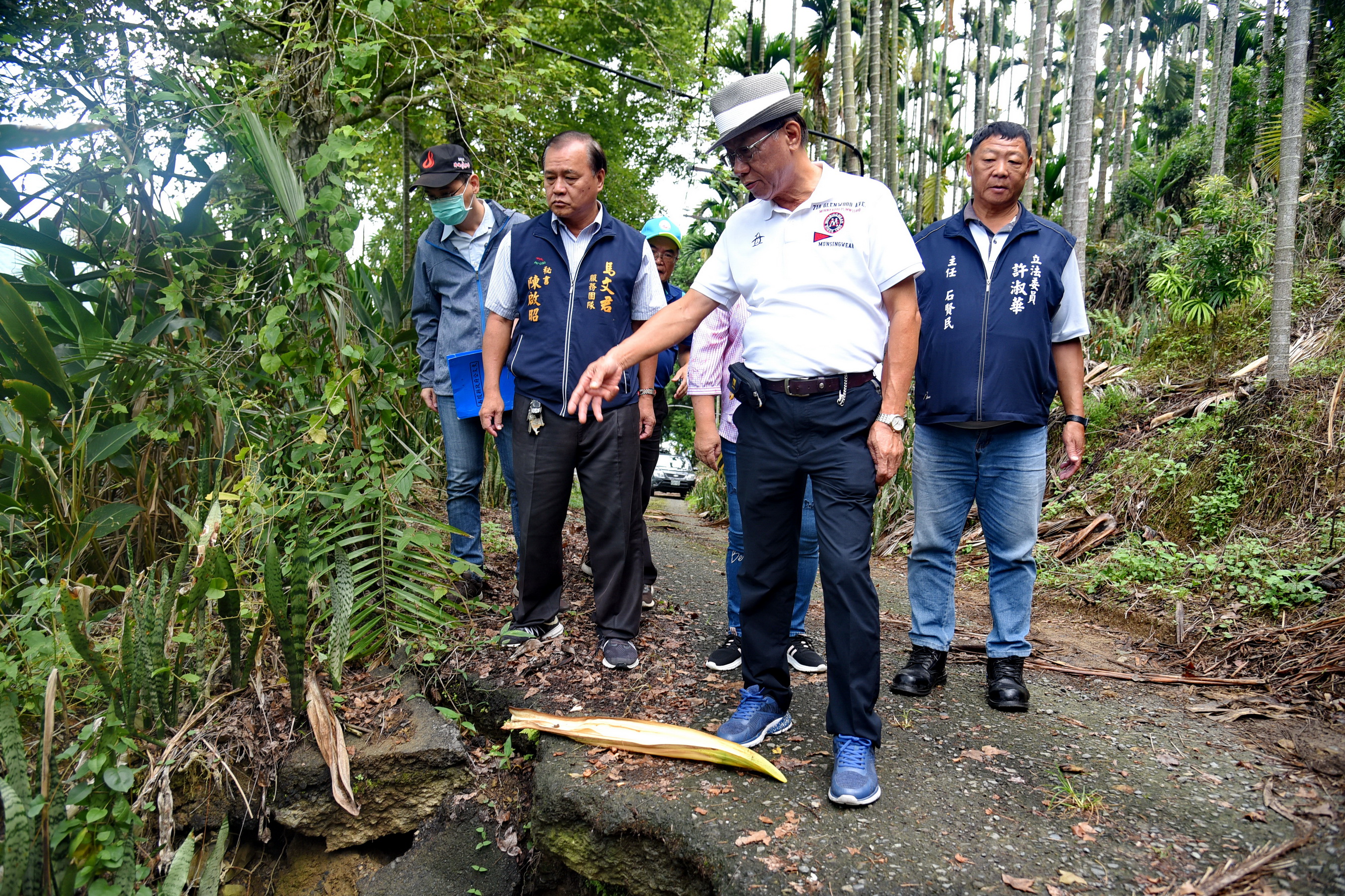 林縣長踩著三部二路掏空破損的路面表示,上安村是典型的農村聚落,村內產業道路肩負村民生活交通與農業生產運輸的功能,且產業道路位處山區,容易受坡面逕流水沖刷影響造成路基掏空、駁坎損毀的情形,影響通行安全,該處路段目前路基已嚴重掏空,路面和駁坎也損毀,有安全疑慮,工務處會盡快籌措約70萬元經費發包改善。另該路段因無排水側溝匯集坡面逕流水排放,因此造成高處逕流水順著農路坡度向下竄流,經破損路面滲入路基,造成路基流失掏空,為改善這個問題,將追加約10萬元經費,施設截水溝及集水井,將逕流水排放排水坑溝,避免路基再被掏空。