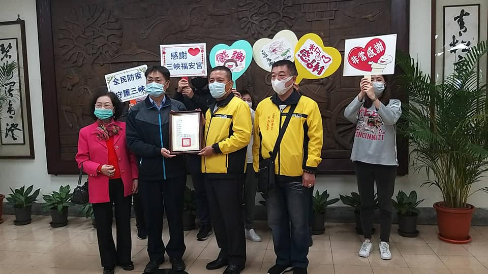 三峽福安宮主委,同時也是三峽里里長黃宗祥表示,有感公所第一線的辛苦民政人員,除了每天電話關懷居家檢疫者外,還要隨同里長進行里內社區、公寓大廈及商圈市場等地方進行防疫宣導,前線民政工作人員背負的責任與工作壓力都相當大,親送檢疫關懷包與打理居家檢疫者生活大小事,協助購買所需醫療及日常生活用品、食材或餐飲等,間接提高了與高風險者接觸的機會,特捐贈慰問禮券7萬5,000元給三峽區公所,藉以慰勞防疫人員的辛勞與付出。