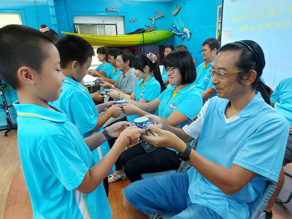同時奉茶感恩老師辛苦教導小孩之恩,小朋友當場在卡片寫下對老師的感恩與祝福。家長們也親自送上應景的文旦禮盒感恩老師及校長對教育的奉獻,最後家長們合唱隱形的翅膀,象徵老師像一個隱形的翅膀默默的呵護孩子、保護孩子,感恩儀式後家長們和校長、全體老師、學生共同享用當地有名的福隆火車便當,全場親生師備和樂融融。