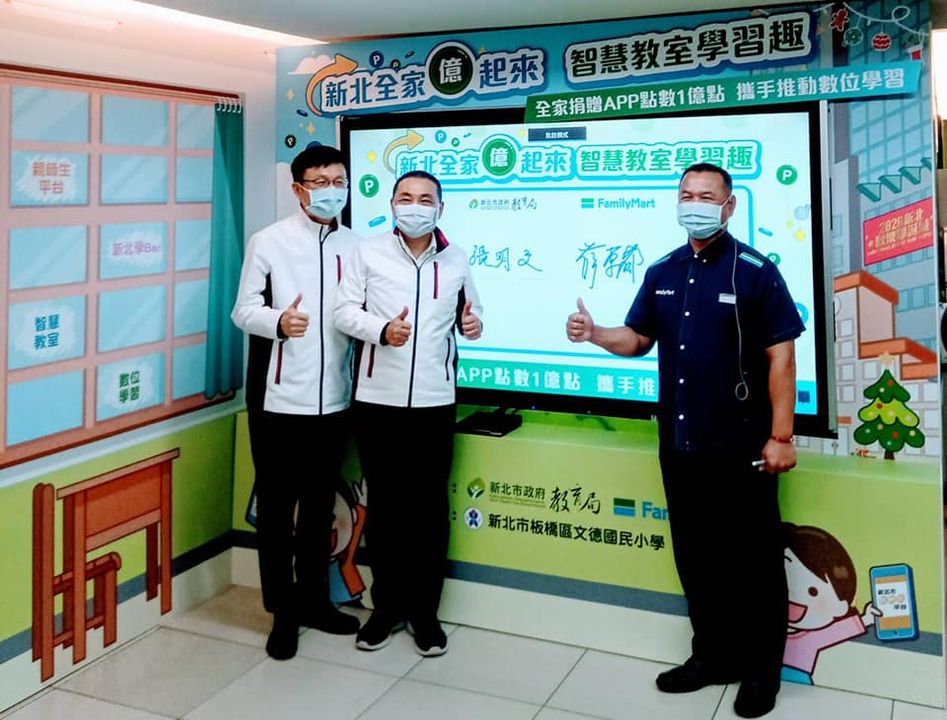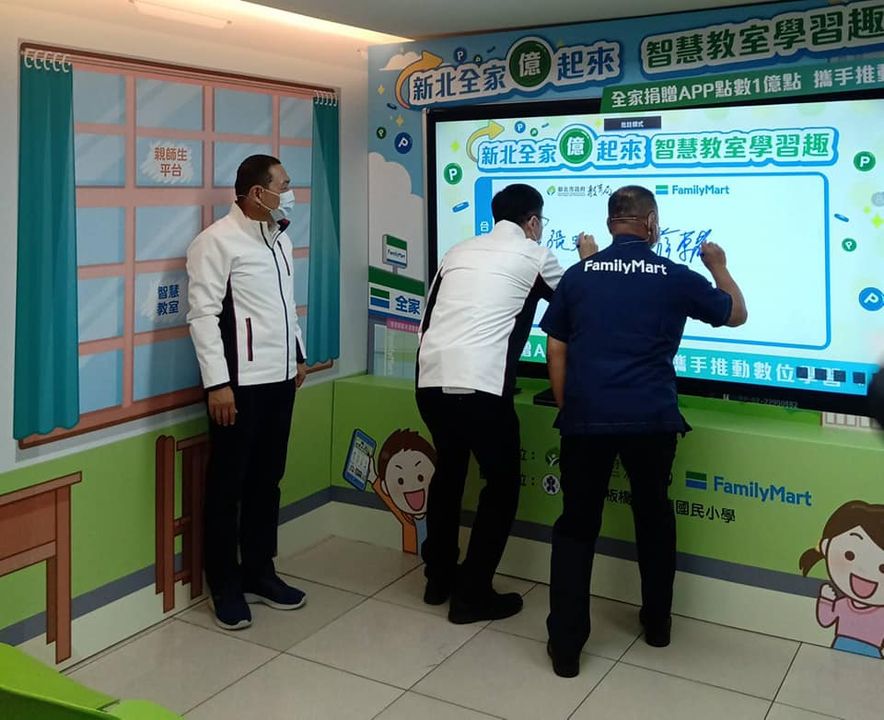 【新北市訊】新北市府攜手全家便利商店推動數位學習,今(10)日舉行「全家便利商店捐贈1億點app會員點數記者會」。市長侯友宜親自出席見證簽約儀式,更化身「侯老師」與學生一起運用智慧教室設備體驗數位學習累積點數及兌換禮物,推廣運用科技輔助學習,達成「教室無邊界、學習無國界」。