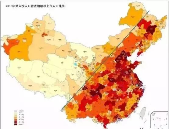 我把這樣的格局叫做“陰陽割分曉”,再來看一下中國。中國本身也有一條陰陽線,這就是“胡煥庸線”。它提出於1935年,這是一條清晰的、幾乎瞬間就從熙熙攘攘變得人煙稀少的分界線。線的東南邊,是“小橋流水人家”,國土面積佔當時版圖的36%,人口占96%,線的西北邊,是“大漠長河孤煙”,面積佔64%,人口只佔4% ,人口密度相差40多倍!