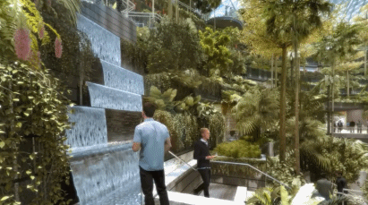 樟宜機場內最引人注目的景觀是足有40米高的“ 雨旋渦 ”也是全世界最高的室內瀑布大約有十幾層樓高