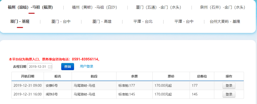 旅客通過福建省交通運輸廳網站“台灣海峽兩岸海上客運票務平台”,即可對福建沿海至金門、馬祖、澎湖海上客運航線(小三通航線),包含福州琅岐至馬祖福澳,福州黃岐至馬祖白沙,廈門五通、泉州石井至金門水頭 4條航線,福建、浙江至台灣本島海上客運航線,含廈門至基隆、台中、高雄,平潭至台北、台中,以及浙江台州大麥嶼至基隆 6條航線的往返航班時間、票價、餘票等信息進行一站式查詢,並支持在線定購票、支付、退票等全流程服務。