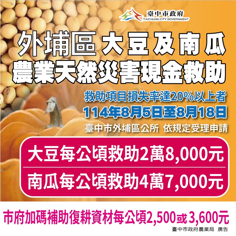 市府農業局指出,台中市外埔區大豆及南瓜因受114年丹娜絲颱風及0708豪雨造成部分根系受損、葉片黃化、瓜蔓萎凋枯死。農業部今日公告台中市外埔區為辦理大豆及南瓜114年丹娜絲颱風及0708豪雨農業天然災害現金救助地區,大豆每公頃救助2萬元8,000元,南瓜每公頃救助4萬7,000元,請台中市外埔區種植大豆及南瓜損害率達20%以上農民,自明日起至8月18日止攜帶國民身分證、存款簿及合法土地證明文件,向受災土地區公所提出申請,逾期不予受理。