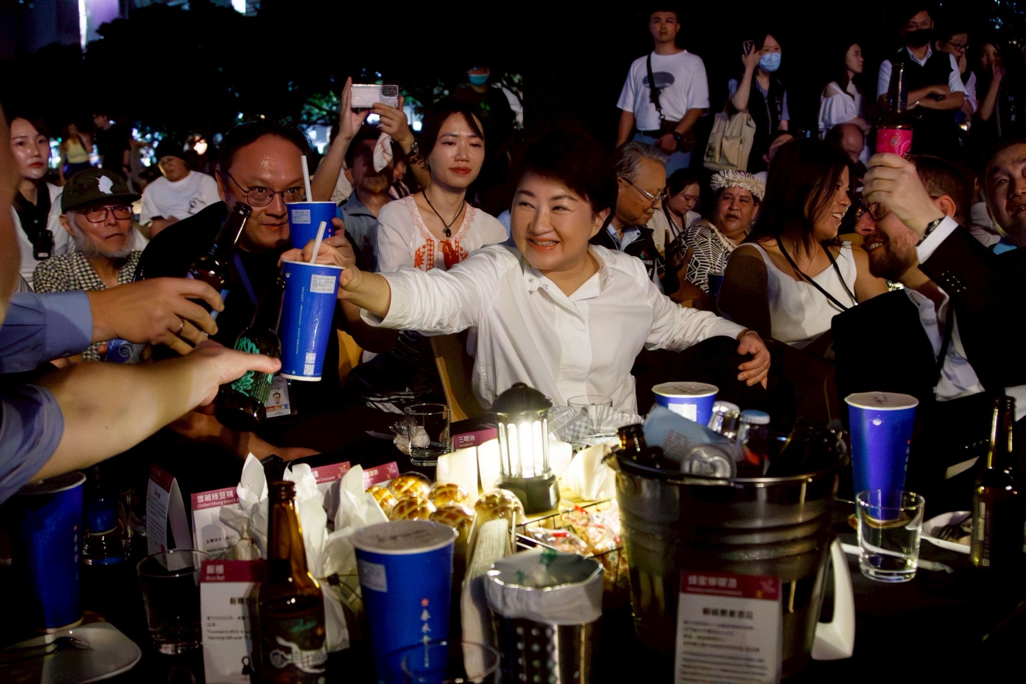 盧市長簡短40秒旋風式致詞,隨即鋪上野餐墊席地而坐,與貴賓一同享受台中美食,並和現場民眾熱情互動,一同享受爵士樂。「Enjoy it!」盧市長說,歡迎來台中爵士音樂節,一起共享美好夜晚。