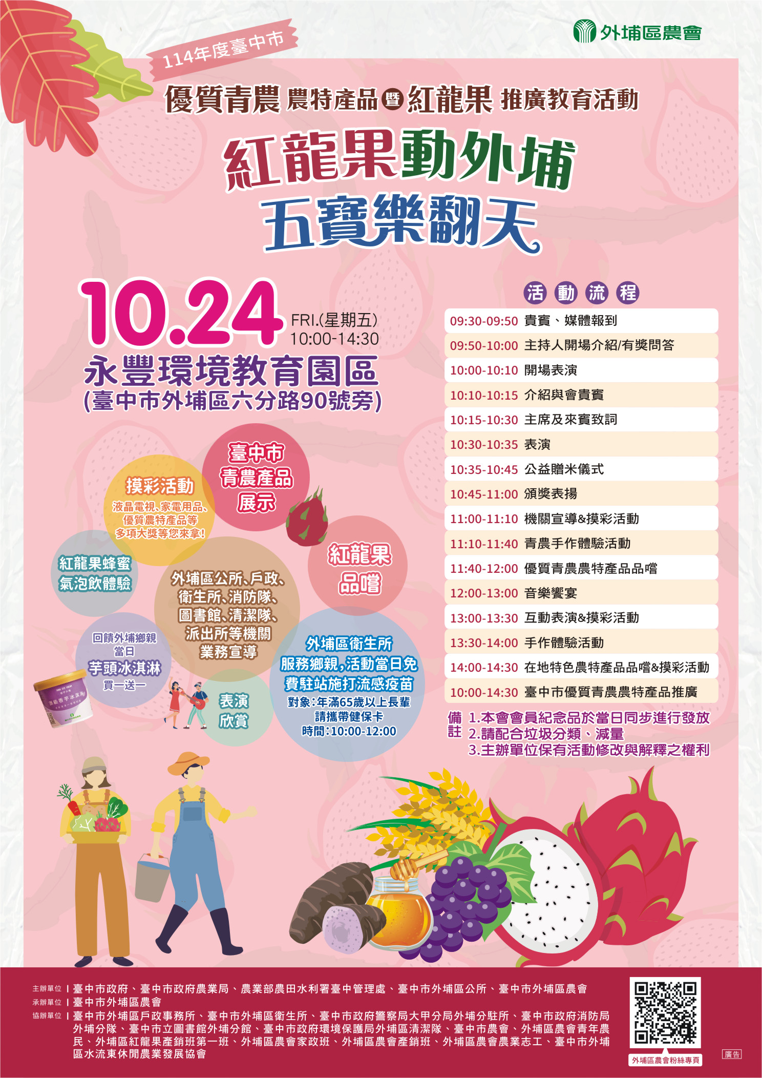 【本報訊】台中市外埔區為紅龍果的重要產地,擁有35.94公頃的種植面積,年產量高達855公噸。為了推廣外埔優質紅龍果,台中市政府農業局輔導外埔區農會舉辦「114年度台中市優質青農農特產品暨紅龍果推廣教育活動」,活動預定於10月24日永豐環境教育園區舉行,期望提高台中市優質紅龍果的品牌能見度。