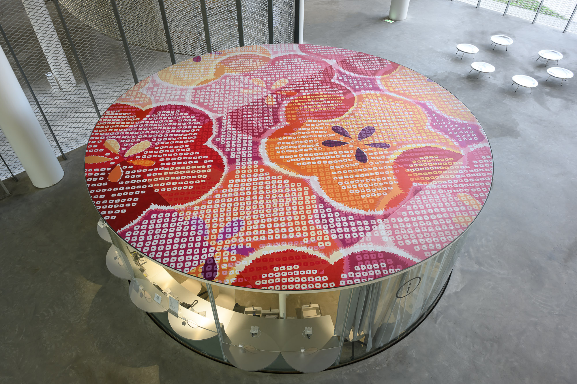 林明弘的《再製》(Processed)則以另一種姿態與建築結構巧妙交織。兩組手繪梅花圖樣佔據入口大廳的兩間玻璃屋屋頂:一組線條精確,另一組錯位重疊,透過如印刷過程中的重疊與錯置手法,將具有時代意義的「台灣花布」圖騰賦予新意。當觀眾在連通美術館與圖書館的天橋上移動時,可以發現圖樣隨視角轉換而變化,構成一場關於感知、觀看與空間的詩意對話。林明弘認為觀眾的觀看也是作品的一部分,使藝術不再僅是被注視的對象,而是與建築、身體、光影共同生成的經驗。