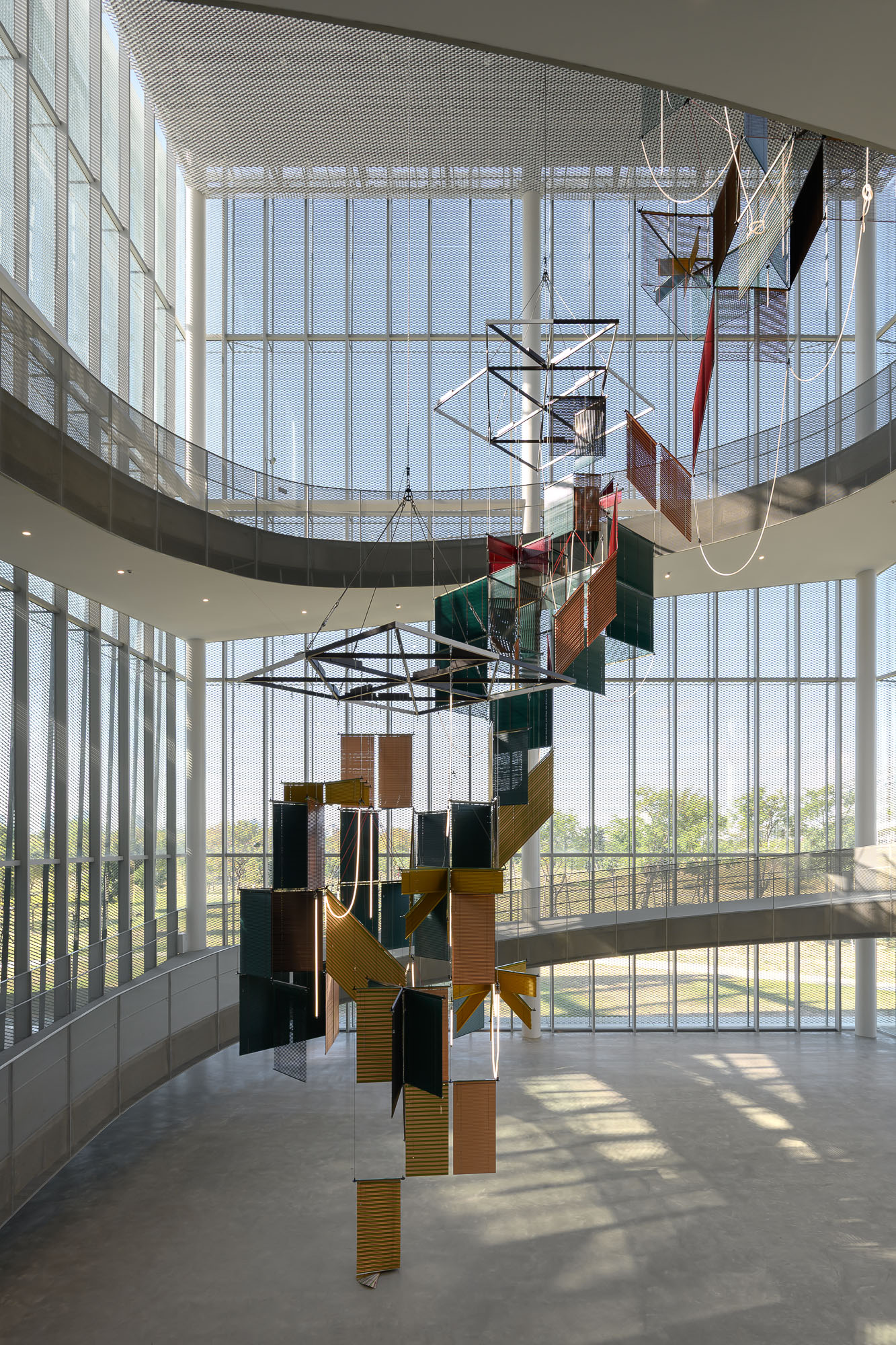 梁慧圭的作品《流動奉獻-樹蔭三合》(Liquid Votive–Tree Shade Triad)為她在台灣的首件委託創作,靈感取自世界各地共通的敬樹傳統。作品懸掛於美術館中庭,挑高27 公尺讓這件作品宛如一棵倒生著、連結天地的「宇宙之樹」。作品以她標誌性的百葉簾結構構成,日間,金屬葉片反射自然光影;夜晚,則映現著柔和的螢火蟲微光,與環境的呼吸節奏呼應。梁慧圭期待觀眾沿著美術館坡道環繞漫步,在移動與光影變化中展開一場關於時間與共感的冥想。