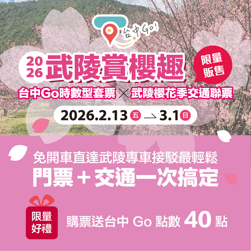 [本報訊]115年武陵櫻花季即將浪漫登場,台中市政府交通局推出「台中Go時數型套票×武陵櫻花季交通聯票」,活動期間自2月13日至3月1日,為期17天,整合865區公車、武陵接駁專車、武陵農場門票及台中Go 48小時公車暢遊套票,讓民眾透過單一平台即可完成交通與旅遊規劃,一票在手,輕鬆啟程賞櫻行程。交通聯票自1月20日中午12時起開放預購,每日限量8席,數量有限,籲請民眾提早規劃、把握機會。