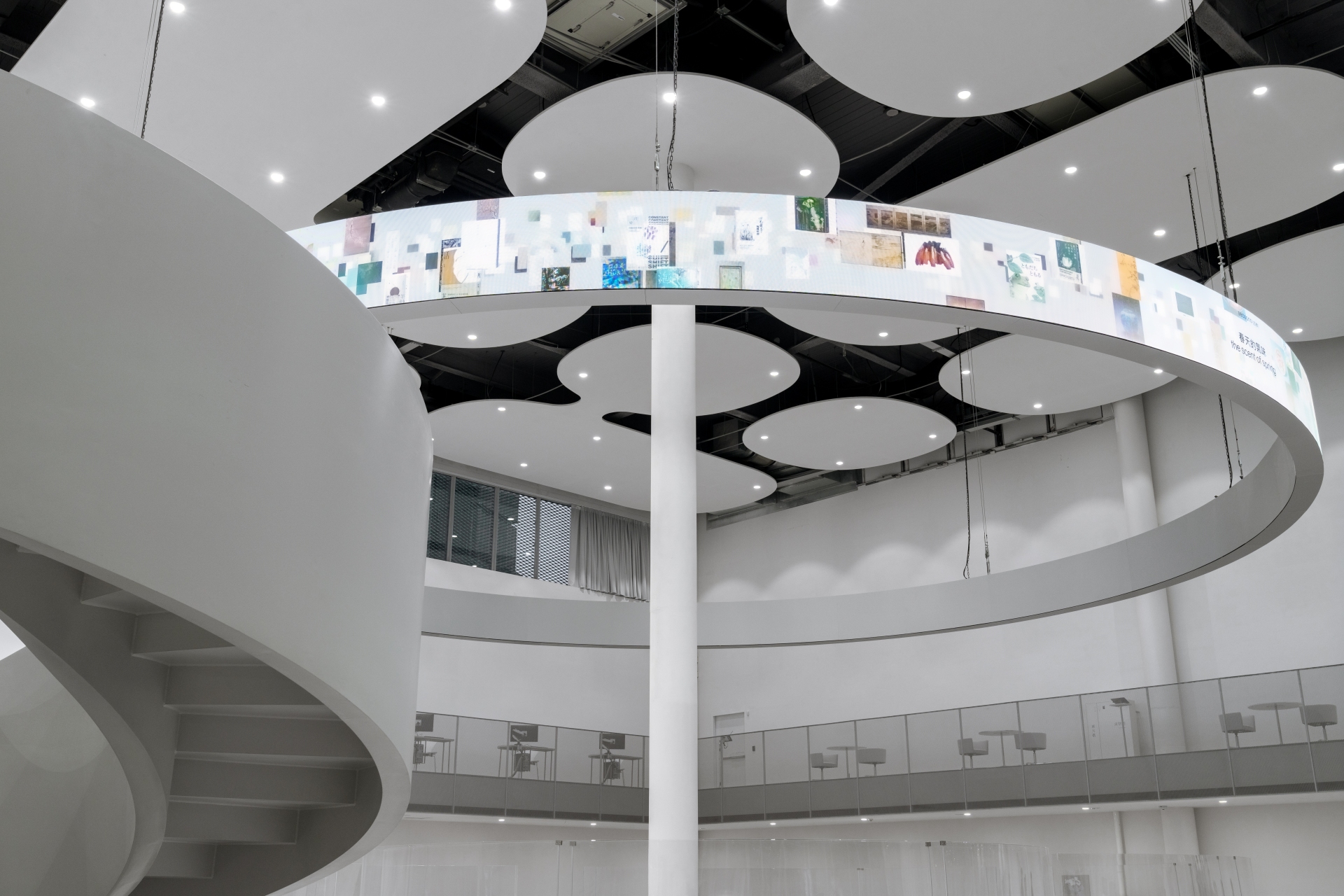 「漫遊洞」的影像內容並非固定播放,而是由AI以圖書館藏資料運算生成。系統以「四季」、「情緒」、「時間」、「水」為主題軸線,將圖書館最新出版的書籍中與美術館藝術品重新建立關聯。例如當畫面出現春天花開的景象時,螢幕內容會延伸介紹描寫自然與季節的文學書籍;當影像轉為流動水紋時,同時又會連結到關於海洋、旅行或哲學思考的書目。不同主題在畫面中交織流動,使知識不再只是靜態分類,而像故事般不斷展開。