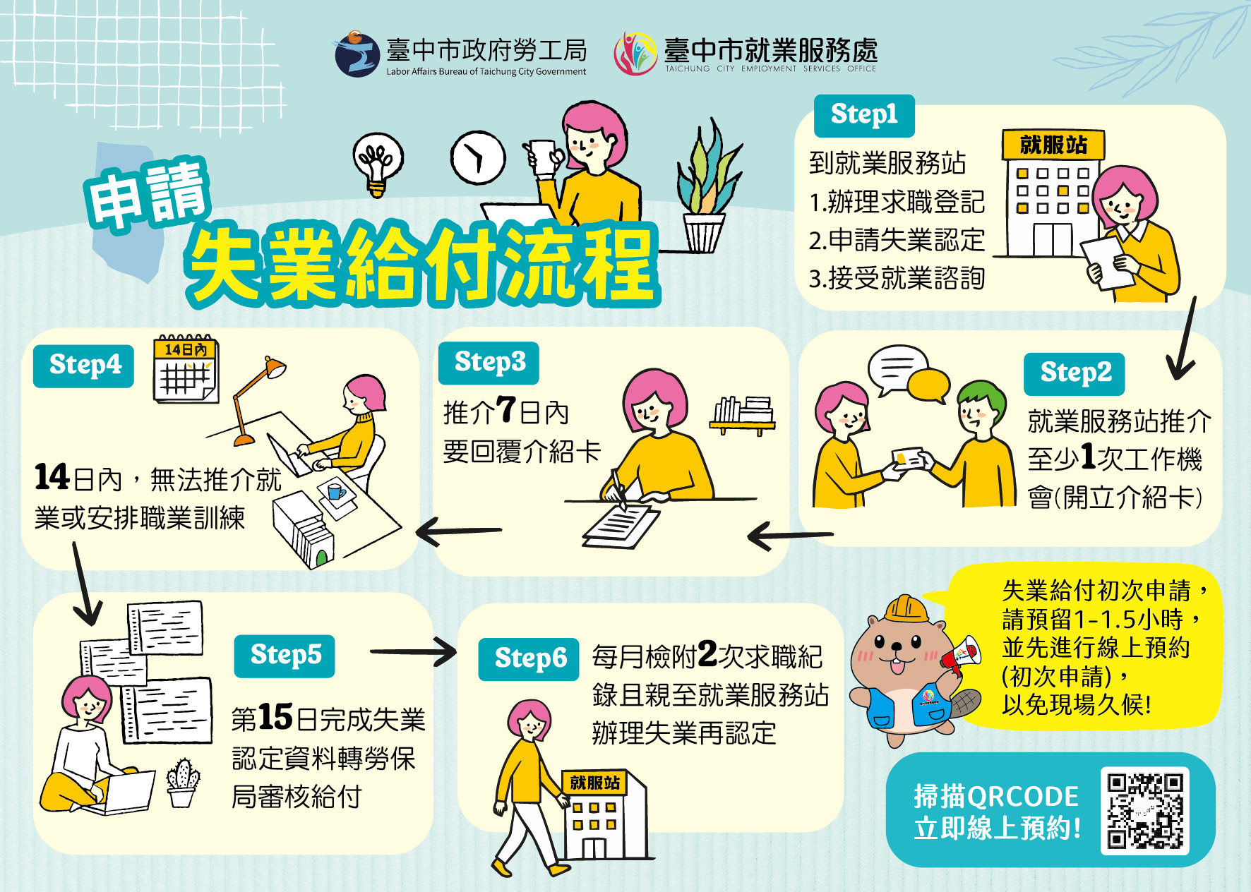 勞工局長林淑媛表示,受僱勞工遭遇非自願離職時,就業保險提供有失業給付、職業訓練生活津貼等給付項目,以保障勞工失業一定期間的基本生活保障;勞工局為協助失業勞工迅速了解失業給付申請流程及減少初次申請等待時間,今年度特別印製「失業給付服務小卡」及提供「線上預約申辦」等便民措施。