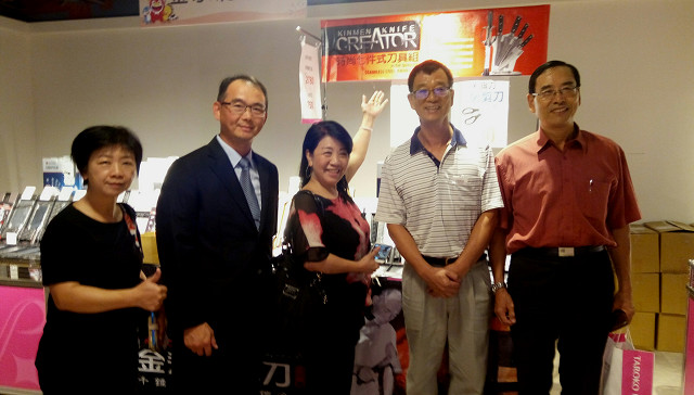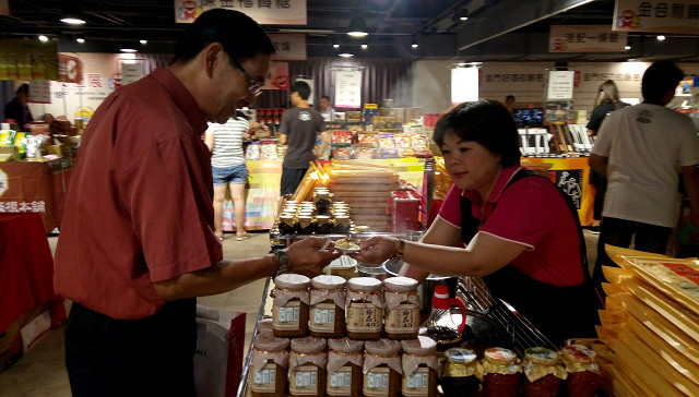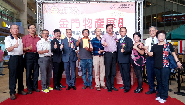 「金門物產展」各專櫃特賣安排有金門高梁酒、砲彈鋼刀、貢糖、一條根等金門名產,現場有豐富的金門傳統美食,吸引不少民眾佇足選購。代表好友陳大雄競標李淑睿表示,親愛的好友,有時間邀朋友前去捧人場,或試吃貢糖、麵線、喝58金門高梁,不過菜刀可不能試喔!呵呵呵!我又敗家了啦!戰利品不少!