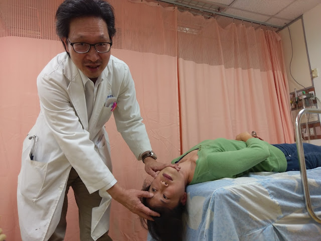 每一側的耳朶各有前、後及平行三個半規管,至於是哪個半規管出問題?可以藉一些臨床的誘發試驗來確定,像是一些基本平衡測試,請她坐到床上,誘發試驗讓她頭轉右側再瞬間後躺時看到強烈的眼振,確定她是右側後半規管中的耳石症。