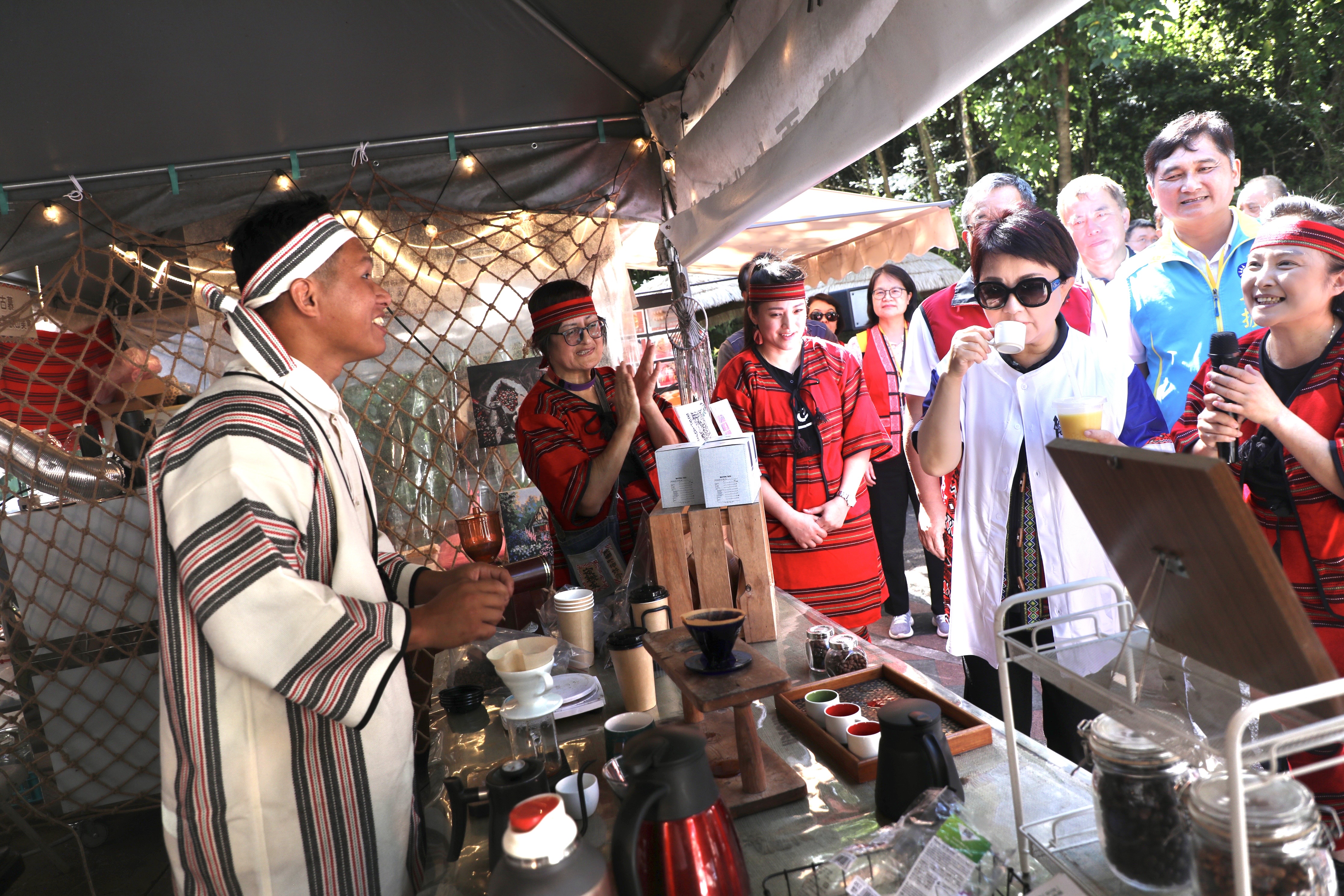 市集現場氣氛熱絡,泰雅族人以悠揚歌聲熱情迎賓,還有返鄉青年自創咖啡品牌、南部族人每週返山擺攤,新住民融入部落創業故事處處可見,盧市長逐一探詢創業歷程並給予鼓勵支持,現場還有「燕姐小吃」攤商大喊:「市長我愛妳!幫我拍照!」場面溫馨逗趣。她也推薦市民搭乘850路觀光公車直達谷關,配合「雙十公車」政策,10公里內免費、超過僅收10元,交通便利又經濟實惠。