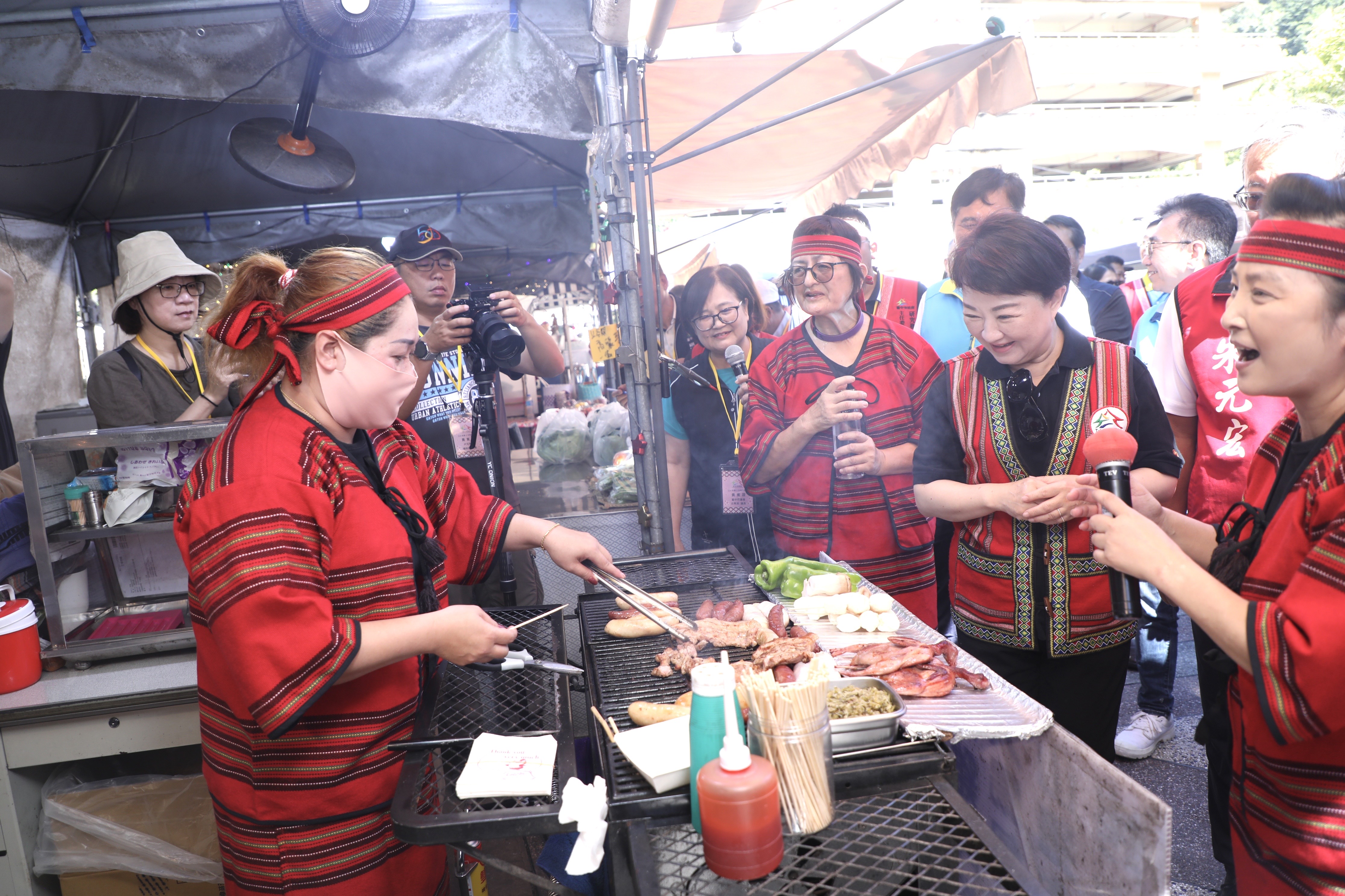盧市長指出,疫情後市府積極促進谷關觀光經濟,重新整修派出所旁廣場與免費冷熱泡腳池,結合原住民市集營運,讓遊客在健行泡湯之餘,也能深入體驗原住民文化與美食。今日她再次來訪,親自品嚐馬告香腸、炸年糕、小米粥、烤山豬肉、五葉松汁等特色小吃,並採購頭帶、編織包與飾品,大讚「便宜又有特色」,肯定族人以友善耕作與工藝傳承展現文化力與生活力。