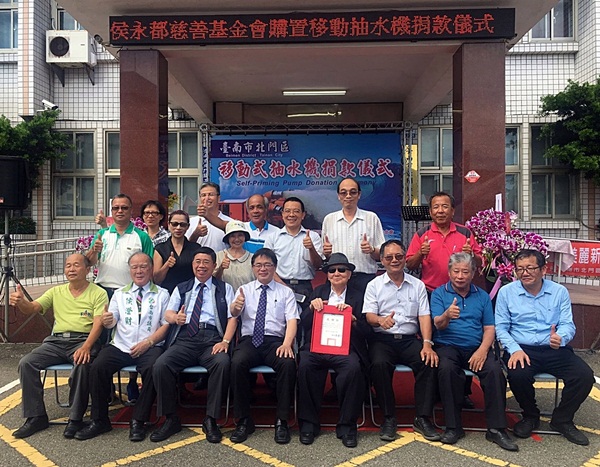 【記者于郁金/臺南報導】台南紡織公司、南紡購物中心董事長,兼財團法人侯永都社會福利慈善事業基金會創辦人侯博明,得知臺南市北門區長年飽受淹水之苦,本於企業回饋家鄉的理念,22日以侯永都社會慈善事業基金會名義,捐款200萬元購置移動式抽水機,將讓北門區水災緊急搶救設施更加完善。
