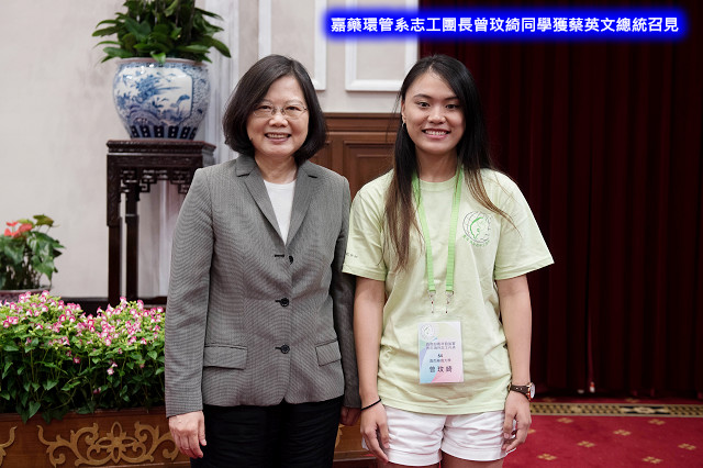 【記者于郁金/臺南報導】嘉南藥理大學環境資源管理系培育無數環保尖兵,多年來利用假期遠赴東南亞,協助當地民眾解決環境污染問題;日前,由該系學生組成「國際學習服務團」,獲選為教育部今年青年海外和平工作團代表之一,將於8月前往泰國展開為期1個月的志工服務;6月20日,該系碩士班研究生、也是擔任團長的曾玟綺同學獲總統蔡英文召見,並勉勵志工團發揮專長與熱誠,善盡國民外交,成為臺灣國際技職專業形象的最佳代言人。