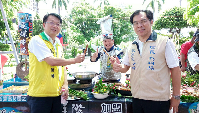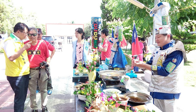 3、榮民楷模智慧食材發明家廖盛芳挑大師,活動前一日佈置、搬器材,當日一早非常辛苦!花了6小時站在太陽下,做最美味料理讓大家品嚐,感謝盡在不言中!