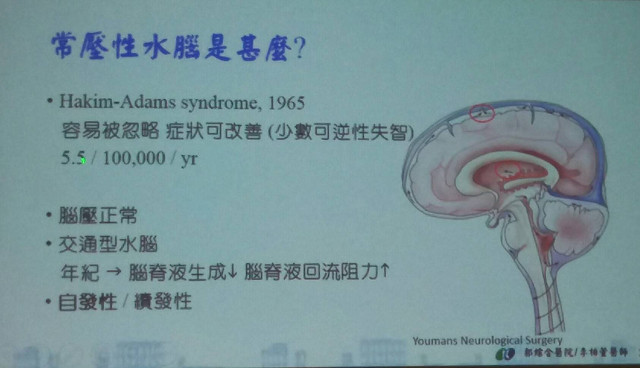 【記者于郁金/臺南報導】常壓性水腦是一個主要發生在老年人身上的疾病,水腦即是腦部異常積液,腦脊液存在著整個中樞神經系統的內外,總量大約150毫升,具有緩衝保護和代謝循環等功能。