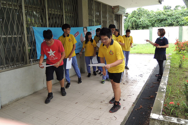 當主持人一喊「預備開始!」,各年級依序出發,學生們專心看地圖,過程中不時與同學討論尋找檢查點,為了得到好成績,學生們不畏大太陽恣意曝曬,汗水爬滿他們的雙頰,個個卯足全力,在校園中競相比賽誰最快找到檢查點並回答菸害防制相關問題。