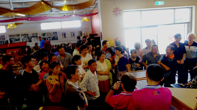 8月12日天氣依舊炎熱,藏金閣特地為來參觀或競標的民眾準備紙板扇,為酷暑帶來一些涼意,9時許,已陸續湧入人潮,民眾已在自己屬意的二手家具前駐足,反覆敲酌,欣賞得自得其樂,果然號碼牌不到10分鐘全數發完,沒拿到的民眾只好請他們跟人家競標了,且當日似乎來了不少首次來競標的,頻頻問來過的民眾如何競標,果真新手果然會生疏,原價2500的大理石客廳組,兩位太太競標,你來我往,原標者的先生還出手阻撓,但還是無法阻擋女人的購物魔力,由原標者4850元得標,但周邊民眾說還是比市價划算,了解之下,原來兩位都是新手,參與競標的陳太太來自新營因慕名特地坐計程車前來的,為嘗試如何競標,一路喊上去,只是想試試水溫而已,也沒想會一路標到快兩倍,旁人聽了超傻眼。