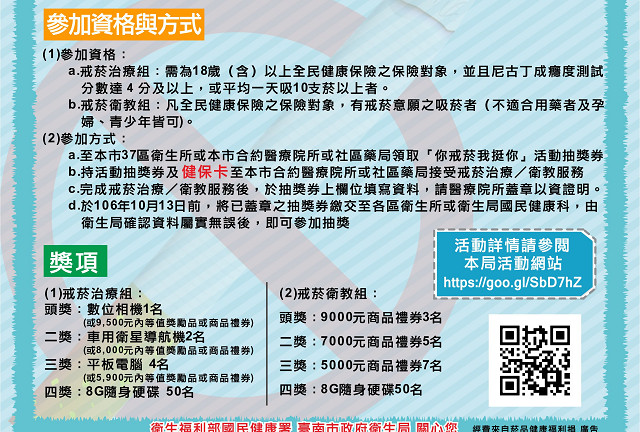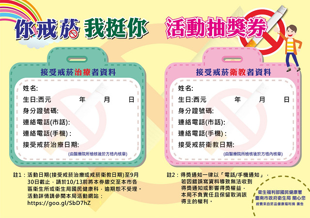 臺南市衛生局表示,有鑑於此!今年辦理「你戒菸,我挺你」戒菸抽獎活動,即日起至9月30日止,有戒菸意願並符合二代戒菸資格之民眾,至本市333家提供戒菸服務機構院所接受戒菸服務即可參加抽獎活動,就有機會獲得最大獎9000元商品禮券唷!活動詳情請上本局官網(https://goo.gl/SbD7hZ)查詢。