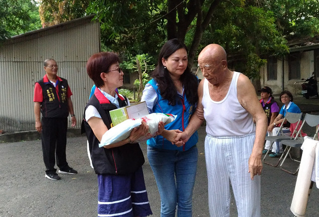 中秋月圓人團圓,25日市議員林燕祝上午率領數十名志工們,攜帶10公斤白米、旺旺米果、涼爽衣等民生用品到永康區六甲頂附近的陸嘉社區,受到榮民們熱情歡迎,神情愉悅地和到訪者閒話家常。