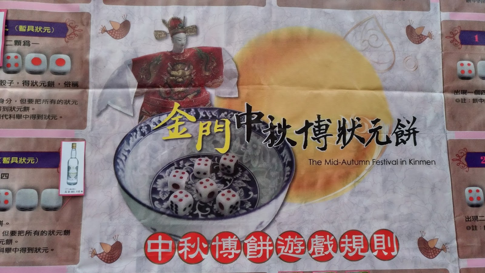 「博餅」就是擲骰子遊戲,擲到的彩品是餅,過去金門地瘠人貧,家家戶戶都希望靠著科舉及第來謀取功名,為讓地方居民熟悉科舉制度,因此將6個骰子代表古科舉中的6個階級(狀元、榜眼、探花、進士、舉人、秀才);根據金門縣政府以往辦理「金門中秋博狀元餅活動」,是依循博餅古制辦理,參賽者必須經過「鄉試、會試、殿試」3個關卡,結果依科舉六科依序排名,以6種餅分別代表不同身份,亦即是「狀元餅者即狀元;對堂餅者是榜眼;三紅餅者探花也;四進餅是進士、二舉餅是舉人、一秀餅就是秀才。」此外,為使活動更加豐富、熱鬧,場邊亦結合金門特色傳統及古早味童玩,不論大人小孩都能玩的盡興!