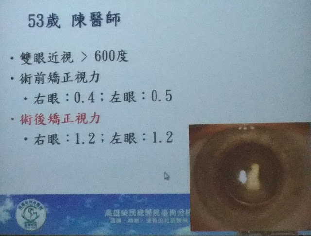 48歲郝醫師,兩眼都有1000度以上的高度近視,由於門診病患眾多,整天都得盯著電腦工作,然而近兩年來開始發現視力急速惡化,經診斷後發現兩眼均有早發性白內障,而且無法以眼鏡改善視力,同時也發現左眼有黃斑病變,在與李尹暘主任討論後,郝醫師先後經過左眼視網膜手術與雙眼白內障手術,目前雙眼視力已進步至0.9以上,也大幅減少對近視眼鏡的依賴,又可以恢復正常的看診工作。