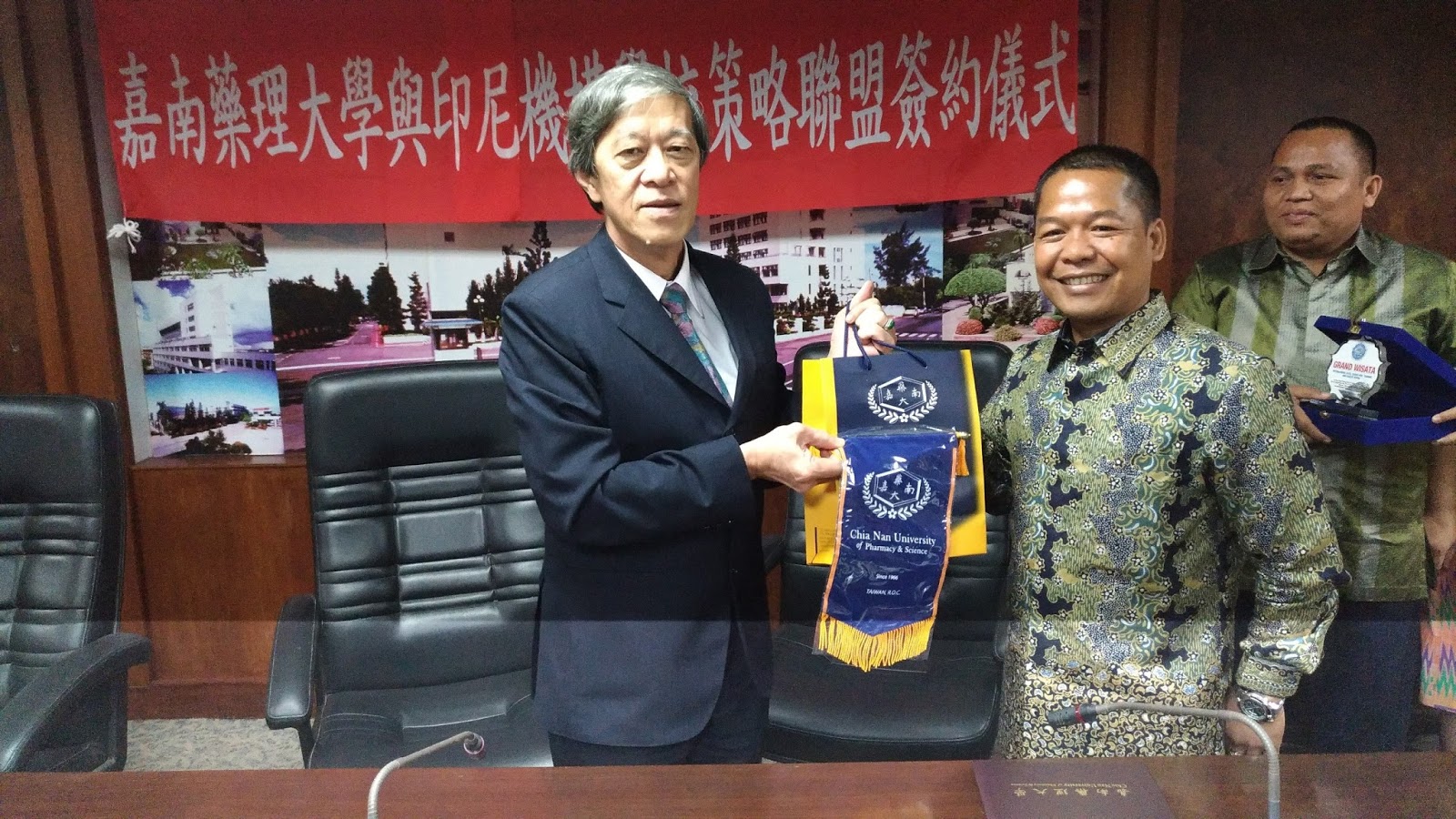 臺印教育合作備忘錄由Ali Wardana董事長、Nurmawati Napitupulu M. Pd.董事長,與嘉藥校長陳銘田在行政大樓2樓會議室共同簽署,嘉藥副校長陳鴻助、主任秘書萬孟瑋、研發長張翊峰、人文暨資訊應用學院院長蘇致遠、資訊管理系主任劉忠峰、應用外語系主任董幸正,一同觀禮。