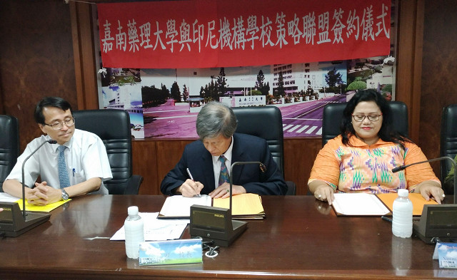 【記者于郁金/臺南報導】「印尼風」吹進嘉南藥理大學!為積極配合新南向政策,嘉南藥理大學積極佈局,該校資訊管理系產學合作國際專班106學年度秋季班已招收印尼115名印尼大一新生,教育成效甚獲肯定,10月18日印尼棉蘭省、井里汶省、棉蘭省、萬隆省聯合教育代表團也慕名前來,雙方在上午11時簽訂合作備忘錄,為明年應用外語系、資訊管理系產學國際專班舖路,亦為擴大印尼招生、產學合作之契機。