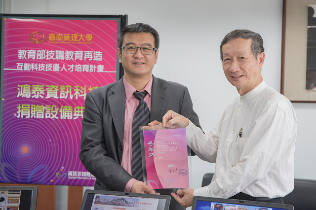 鴻泰資訊科技公司對互動科技人才的培育訓練極為重視,此次捐贈「電子商務教學應用系統」、「商品流通模式教學應用平台」、「庫存管理教學應用平台」、「觀光商務教學應用平台」及「門市經營模擬教學應用平台」,等5項系統平台,總價值高達1,875,000元,由嘉藥校長陳銘田代表受贈。