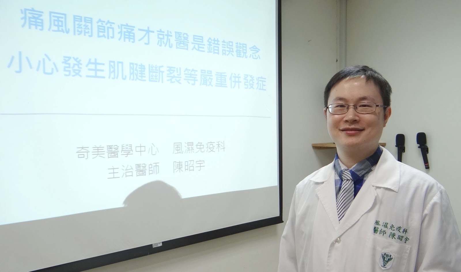 奇美醫學中心風濕免疫科主治醫師陳昭宇舉例說,40多歲胡先生,因為生活型態經常喝酒,已經罹患痛風關節炎超過7年;以往每次痛風關節炎發作時,都是到醫療院所就醫拿些止痛消炎藥,吃個幾天關節痛緩解了,也就不再去理會它;雖然痛風關節炎時常發作,但吃藥可以緩解症狀,並沒有特別警覺,也沒有接受長期的降尿酸治療。