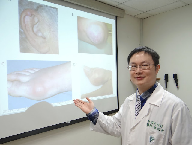 陳昭宇醫師進一步表示,人體內血液中正常尿酸數值是6.8mg/dL,超過就會開始在體內形成結晶累積起來,除了關節內,肌腱、肌肉、皮膚甚至內臟器官都可能累積尿酸結晶;如果持續不去理會,久了之後會開始形成痛風石,就像粉筆灰一樣的沈積物,而且隨著時間進展,會導致一顆顆結節在關節、皮膚、耳殼等地方。