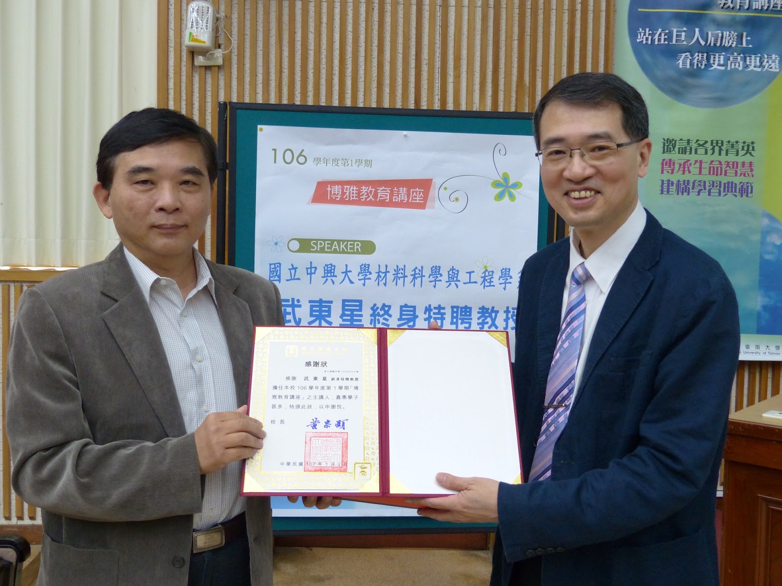 武東星教授畢業於國立中山大學電機工程研究所博士班,曾任大葉大學校長、香港科技大學NAMI研究院研發總監,現任國立中興大學先端產業暨精密製程研究中心主任、材料科學與工程學系終身特聘教授;曾榮獲教育部師鐸獎、中華民國光電學會光電工程獎、國科會傑出研究獎等獎項肯定,並於今年獲選為美國光學學會(OSA)2018年新選會士。