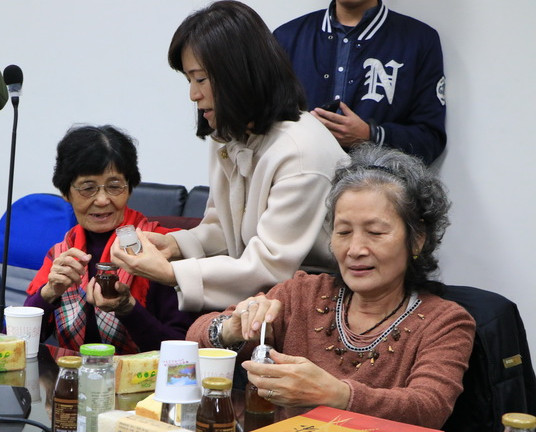 長輩們對於保健飲品大為好奇,拿起來再三觀看、交頭討論,在生科中心人員解說下,興趣十足品嚐起來,老人家私下說「有成大很幸福耶」。