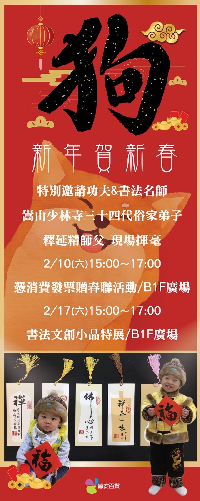臺南德安百貨店表示,此次邀請釋延精師父現場進行書法文創,在2月17日(大年初二)下午15時至17時,歡迎民眾屆時前往參觀。