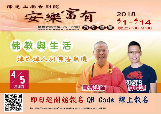 【記者于郁金/郭騏樂/臺南報導】佛光山南台別院安樂富有系列講座,5日晚間主談的講題為「佛教與生活」~律己律人與佛法無邊,邀請佛光山常務副住持慧傳法師、知名作家許峰源二位講師,親臨現場觀眾與網路直播觀賞者,達3,000人次以上。