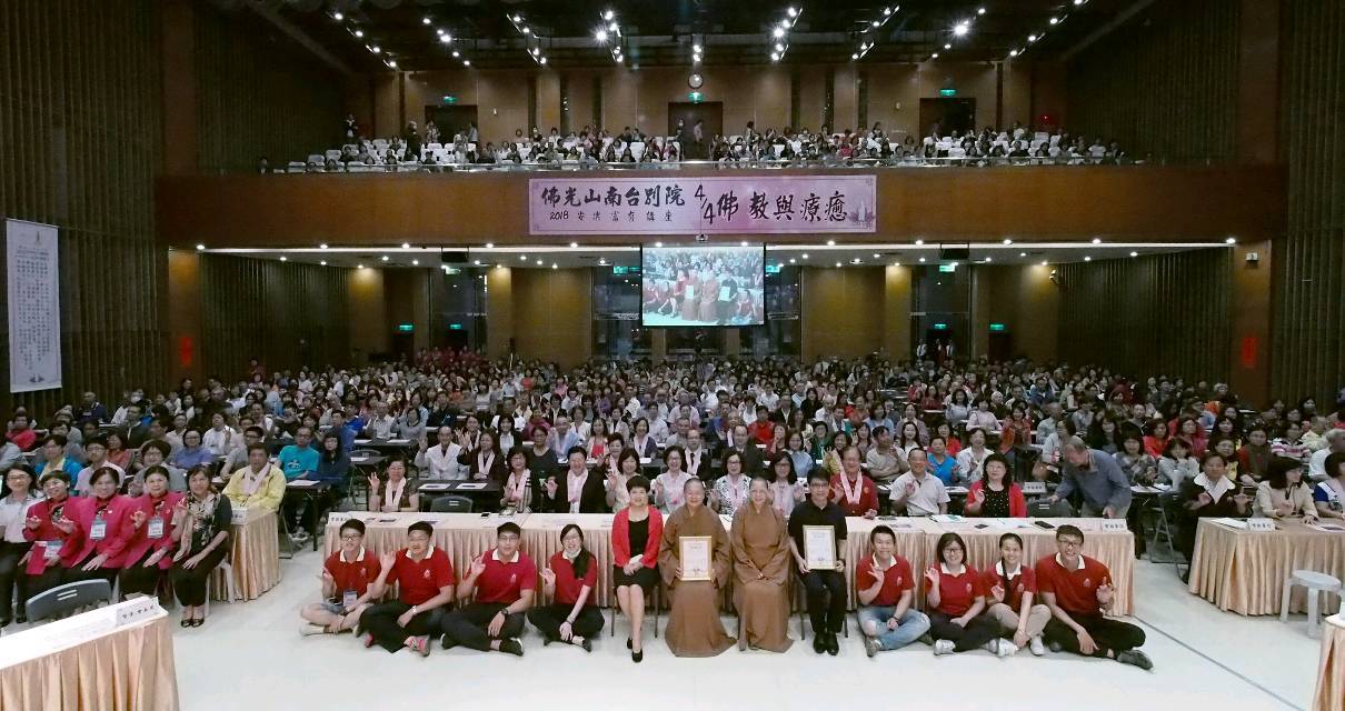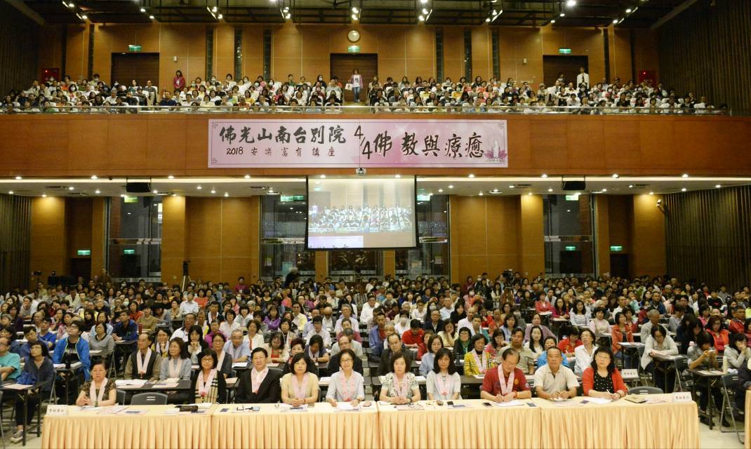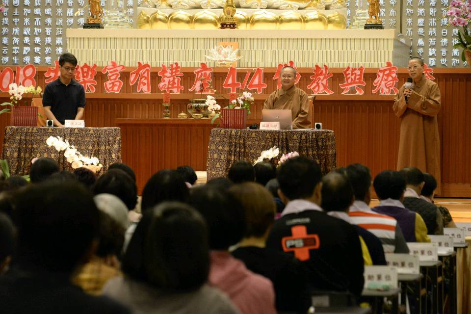 【記者于郁金/郭騏樂/臺南報導】古今醫學耗費龐大資源探究治病良方,佛教教主亦有大醫王之稱,如何幫助眾生開啟療癒之鑰?佛光山南台別院4日晚間安樂富有系列講座,邀請佛光山海外巡監院院長、歐洲總住持滿謙法師與台北醫學大學醫學人文研究所副教授暨知名作家侯文詠講師,從佛教與醫學角度,探討「佛教與療癒~接受與感恩.雋永的省思」,一端是講究實證治療的醫學專業,一端是拔除病根療心為上的宗教師,共同探究生命終極療癒之法,吸引近千人前來聽講。