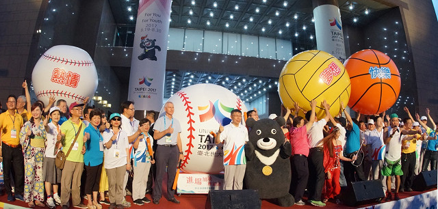 誓師大會在「臺灣元氣球 臺灣熊蓋讚」展開,由分別寫著熱情、快樂、希望與夢想等四個大型氣球傳遞到舞台上,象徵市民朋友雙手傳遞的能量,祝願世大運成功,現場並高呼「臺北我的主場」,由市民朋友也大聲回應「世界歡迎光臨」,熱情歡迎遠道來參加世大運賽事的各國選手,繽紛彩帶從天降下,現場驚喜歡呼聲四起。
