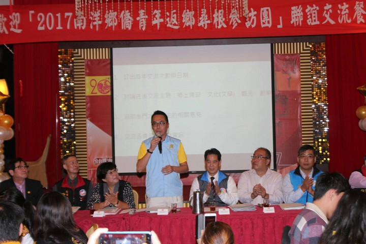 帶著故鄉豐富的溫暖收穫,12月10日參訪團一行走進劍潭海外青年活動中心宴會廳,北區各會旅台百來位鄉親早已熱烈等候迎接,為了與旅居海外僑親青年進一步認識溝通,先舉行交流座談會,在司儀李柔靜引領程序下,由臺灣金門同鄉會總會長李台山介紹各會理事長,包括新北市金門同鄉會副理事長林興源、桃園市金門同鄉會理事長洪成美、金門烈嶼公共事務協會秘書長洪輝樹、金門雙鯉公共事務會理事李文開、金門西園旅台公共事務協會理事長黃耀民、金門珠浦許氏宗親會理事長許丕揚、中華金門旅台翁氏宗親會理事長翁天想、中華金門薛氏旅台宗親會理事長薛作伍、青年團團長周瑋婷、金門縣政府財政處處長許志忠、教育處科長許能麗、北區服務處主任孫允理等來賓;參訪團團長楊質煥也介紹尋根團,包括新加坡金門會館青年團團長許振義、馬來西亞砂拉越金門會館青年團副團長蔡適聰、印尼麻裡巴板金門會館主席夫人李月秀、汶萊福建會館青年團副團長洪惠珊、菲律賓金門同鄉會陳啟修等南洋各區代表。