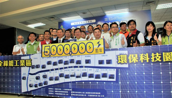 【本報訊】鄭文燦市長18日主持桃園首座100%全綠能光電屋頂工業區啟動活動,他與桃園環保科技園區所有企業代表,共同啟動工業區的第一個全光電屋頂。這個全光電屋頂的設置容量為5MW,預定於明年全部完成發電,估計年發電量至少500萬度,年減碳量相當於7座大安森林公園,是一座成效可觀的太陽能發電站。