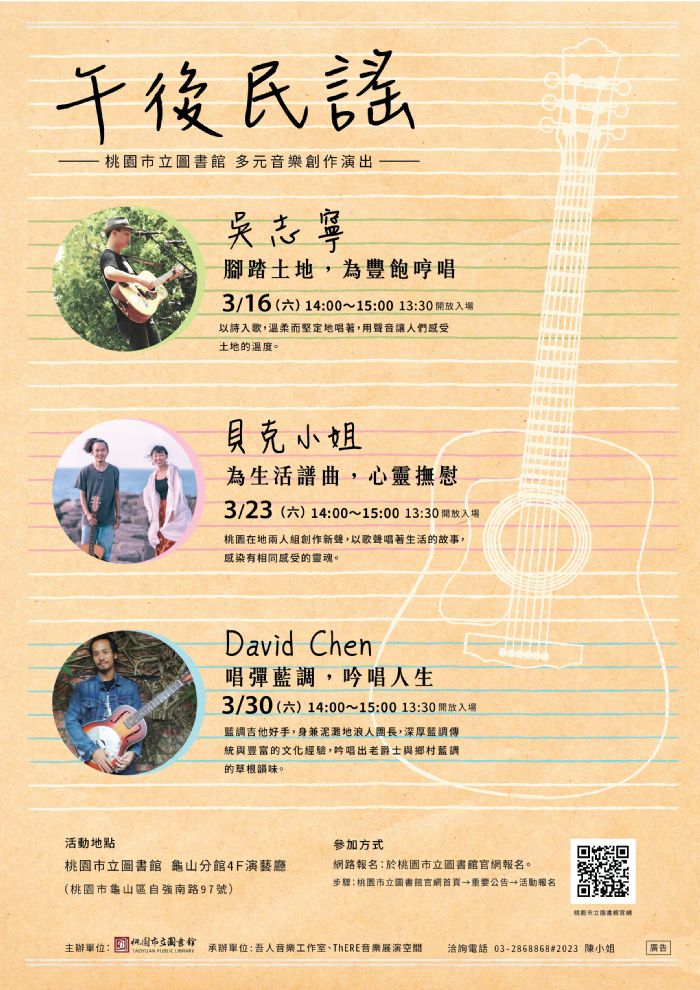 【本報訊】閱讀與音樂,是緊密相連的夥伴;書本中的文字,加上節奏、旋律等音樂元素後,成為承載生活與理念的動人歌詞。桃園市立圖書館辦理「午後民謠―多元音樂創作演出」,共計3場演出,邀請到吳志寧、貝克小姐及David Chen分別於108年3月16日(六)、23日(六)、30日(六)下午2時假龜山分館4樓演藝廳,以吉他與歌聲喚醒觀眾內心的小宇宙。