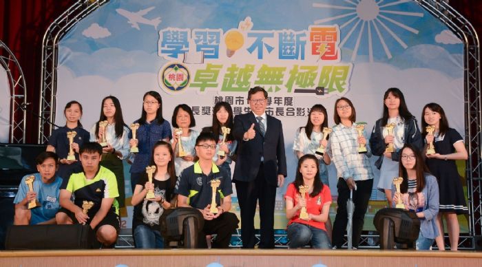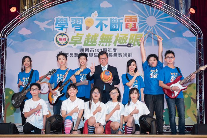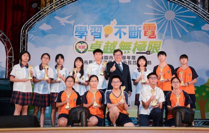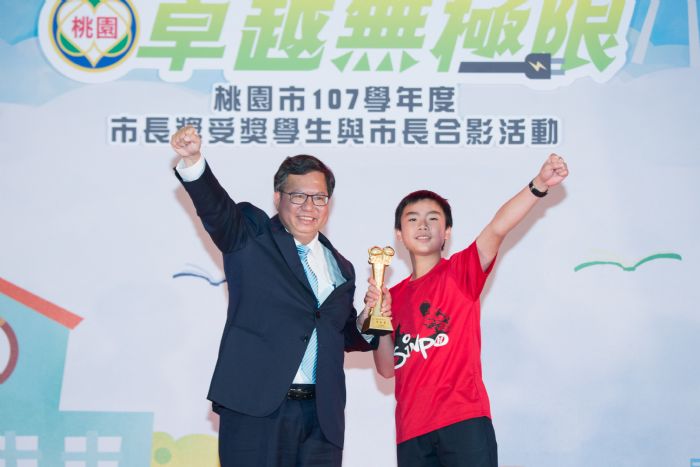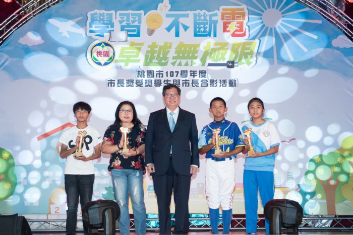 鄭市長說,今(108)年頒獎活動以「學習不斷電、卓越無極限」為主題,勉勵孩子挑戰自我、創造另一個新里程碑,也以「智慧城市、宜居桃園、便捷服務」為概念設計獎座,並致贈包括藍芽喇叭、行動電源及記憶卡等獎品,鼓勵學生在往後的求學過程中也能夠善用數位科技,提高學習效率。