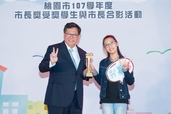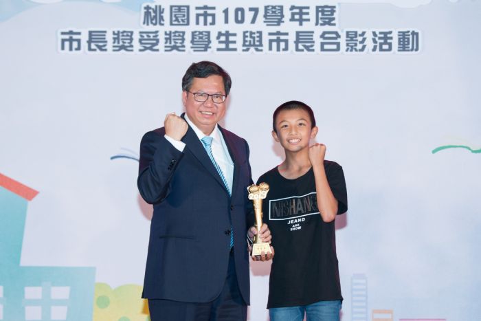 鄭市長提及,今日的榮耀時刻屬於每位市長獎得主,市府特別以「智慧城市、宜居桃園、便捷服務」為主題,設計市長獎獎座,鼓勵學生善用數位科技,提高學習效率。鄭市長說,過去台灣教育充滿升學主義氛圍,重視考試成績,如今則轉向關注啟發教育及探索教育,無論是都會區的學童或是偏鄉地區的學童都有無限可能,他也勉勵同學們在未來學習的旅途上,全力往前衝,發揮自己的潛力。